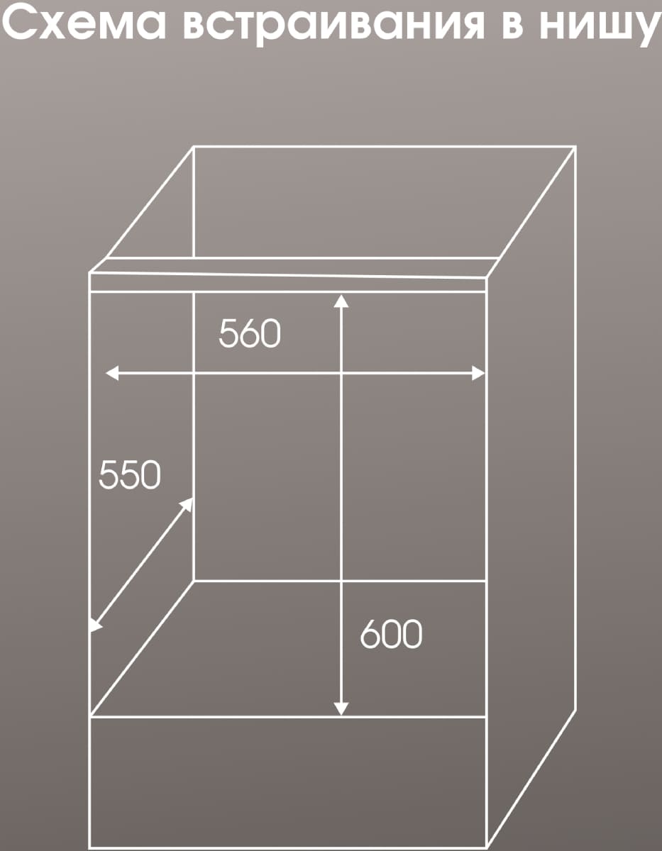 - Размеры ниши для встраивания, ВхШхГ (см): 60x56x55
