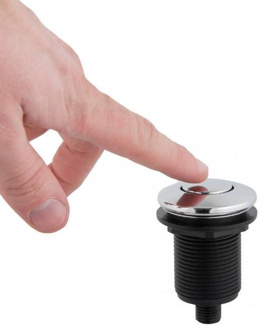 Пневматическая кнопка для измельчителя пищевых отходов позволяет включать прибор посредством давления воздуха, исключая возможность поражения электрическим током при попадании воды. Изготавливается из нержавеющей стали и пластика и располагается на бортике раковины или на столешнице.