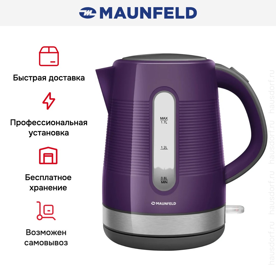 Материал корпуса: пластик. Материал подставки: пластик. Объем (л): 1.7. Цвет: фиолетовый. Мощность (Вт): 2200. Управление: механическое.