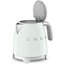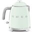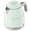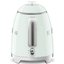Электрический мини-чайник Smeg KLF05PGEU из известной ретро-коллекции в стиле 50-х годов 20 века выделяется благодаря глянцевому корпусу бледно-зеленого цвета. Как и другие модели из этой коллекции, он имеет обтекаемую форму, а оригинальный оттенок корпуса отлично дополняют металлические детали — носик из полированной нержавеющей стали, хромированная ручка и основание. Высота этой небольшой модели — всего 20 см, а объем — 0,8 литра. Для того, чтобы вскипятить чайник и приготовить три чашки чая, понадобится несколько минут, а расход электроэнергии при этом будет минимальным. Корпус изготовлен из безопасного пластика, внутренняя часть — из нержавеющей стали. Скрытый нагревательный элемент способствует не только быстрому закипанию, но и снижению уровня шума.