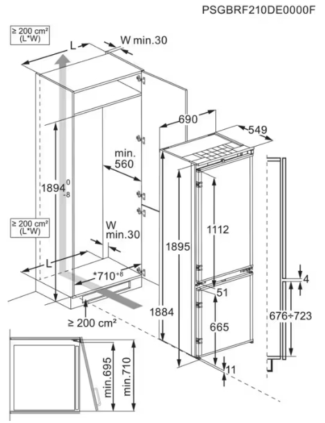 Встраиваемые холодильники монтируются в нишу или колонну. Передняя их часть закрывается декоративным мебельным фасадом и снаружи не отличается от дверцы обычного кухонного шкафа, так что их не нужно подбирать под интерьер помещения. Объем этих холодильников, как правило, несколько меньше, чем у отдельностоящих, так как при встраивании необходимо оставлять свободное пространство для вентиляции. Они отличаются меньшим уровнем шума, а также лучше держат холод и отличаются большей экономичностью из-за дополнительного слоя изоляции. Ассортимент этих холодильников не так велик, как у отдельно стоящих, установка более трудоемкая, а стоимость обычно несколько выше.