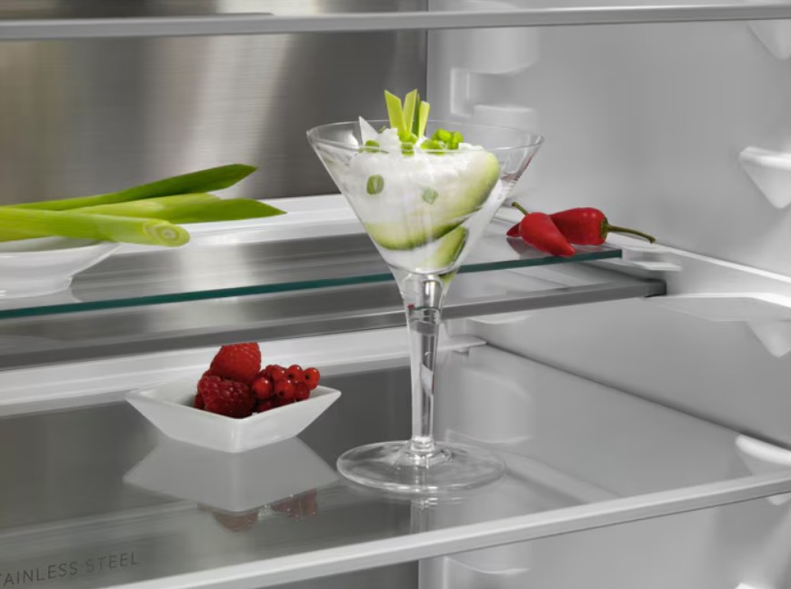 Полки в отделении бывают нескольких типов. Чаще всего встречаются полки из закаленного или ударопрочного стекла. Закаленное стекло выдерживает особенно большие нагрузки до 25 кг, так что на них можно устанавливать посуду из любого материала. Стекло является безопасным нейтральным материалом, не желтеет и не портится со временем, а также быстро и легко моется. Для того чтобы предотвратить проливание жидкости, полки оснащаются металлической или пластиковой окантовкой.
