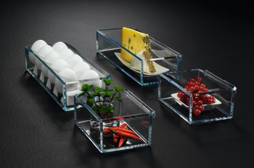 Ящики для продуктов изготавливаются либо целиком из прозрачного пластика, либо часто имеют переднюю прозрачную панель, которая обеспечивает лучший обзор. Полки в большинстве холодильников могут перемещаться по высоте, устанавливаются на специальных направляющих и без труда снимаются для очистки.
