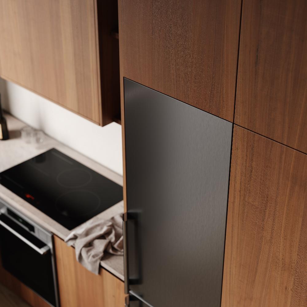 Встраиваемые холодильники монтируются в нишу или колонну. Передняя их часть закрывается декоративным мебельным фасадом и снаружи не отличается от дверцы обычного кухонного шкафа, так что их не нужно подбирать под интерьер помещения. Объем этих холодильников, как правило, несколько меньше, чем у отдельностоящих, так как при встраивании необходимо оставлять свободное пространство для вентиляции. Они отличаются меньшим уровнем шума, а также лучше держат холод и отличаются большей экономичностью из-за дополнительного слоя изоляции. Ассортимент этих холодильников не так велик, как у отдельно стоящих, установка более трудоемкая, а стоимость обычно несколько выше.