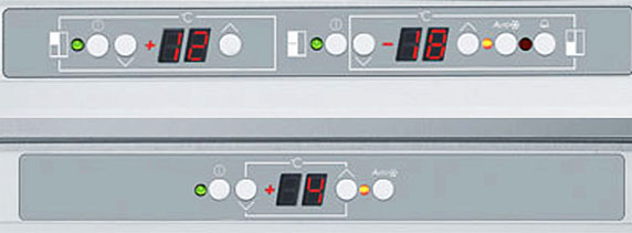 Гораздо точнее сориентироваться по индикаторам можно в холодильниках с электронной системой управления. Эти устройства обычно оснащены дисплеем, на котором высвечиваются значения фактической температуры в холодильной и морозильной камерах. Рядом с ними располагаются кнопки, во многих случаях сенсорные, при помощи которых можно регулировать температуру в каждой камере отдельно, и индикаторы включения этих камер. Здесь же, на панели инструментов, находятся индикаторы, указывающие на активацию дополнительных опций — например, режимов быстрого замораживания и быстрого охлаждения, отпускного режима, блокировки панели управления от детей.