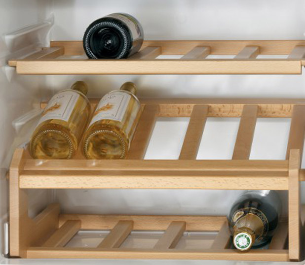 Для стеклянных бутылок, особенно винных и содержащих другие алкогольные напитки, предусматривается размещение на подвесной решетчатой металлической полке. Бутылки на ней располагаются в горизонтальном положении — это оптимальный способ хранения вин. Съемная металлическая полка легко моется под краном.