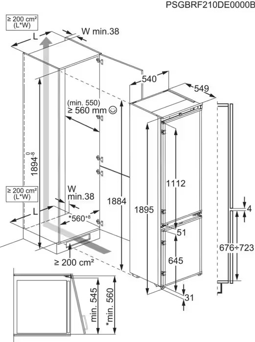 Встраиваемые холодильники монтируются в нишу или колонну. Передняя их часть закрывается декоративным мебельным фасадом и снаружи не отличается от дверцы обычного кухонного шкафа, так что их не нужно подбирать под интерьер помещения. Объем этих холодильников, как правило, несколько меньше, чем у отдельностоящих, так как при встраивании необходимо оставлять свободное пространство для вентиляции. Они отличаются меньшим уровнем шума, а также лучше держат холод и отличаются большей экономичностью из-за дополнительного слоя изоляции. Ассортимент этих холодильников не так велик, как у отдельно стоящих, установка более трудоемкая, а стоимость обычно несколько выше.