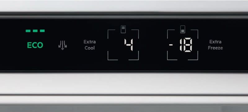 Гораздо точнее сориентироваться по индикаторам можно в холодильниках с электронной системой управления. Эти устройства обычно оснащены дисплеем, на котором высвечиваются значения фактической температуры в холодильной и морозильной камерах. Рядом с ними располагаются кнопки, во многих случаях сенсорные, при помощи которых можно регулировать температуру в каждой камере отдельно, и индикаторы включения этих камер. Здесь же, на панели инструментов, находятся индикаторы, указывающие на активацию дополнительных опций — например, режимов быстрого замораживания и быстрого охлаждения, отпускного режима, блокировки панели управления от детей.