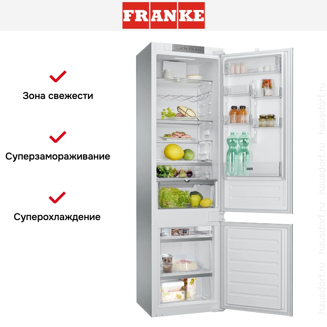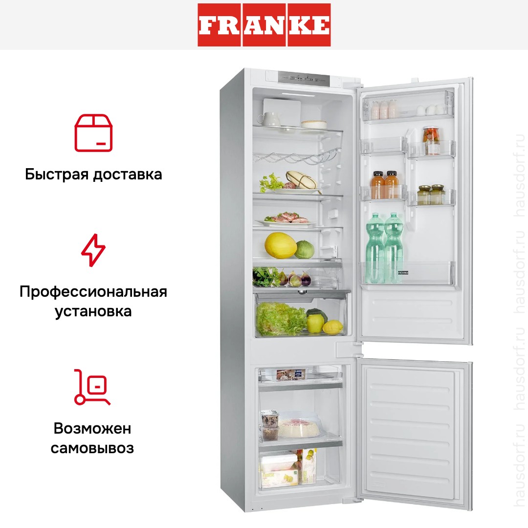 Встраиваемый холодильник Franke FCB 360 V NE D — вместительная и технологичная техника, созданная для требовательных пользователей, ценящих порядок, свежесть продуктов и безупречную интеграцию в интерьер кухни. Благодаря увеличенной высоте и двум раздельным отсекам — холодильной камере сверху и морозильной снизу — прибор обеспечивает оптимальные условия хранения как повседневных, так и сезонных запасов, сохраняя их качество на протяжении длительного времени.
