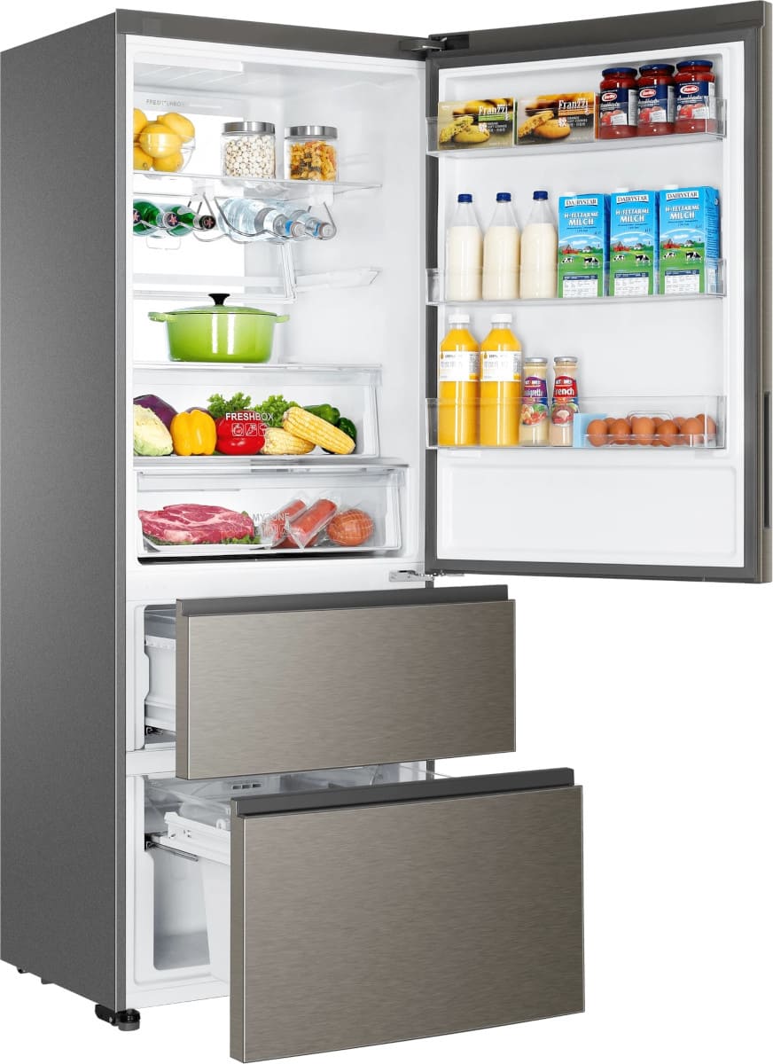 Трехкамерные модели выпускаются в нескольких вариантах. В некоторых случаях в качестве третьей камеры поступает так называемая зона свежести — отделение, где поддерживается температура около 0 градусов. В другом варианте подобные модели имеют морозильную камеру, состоящую из двух выдвижных ящиков.