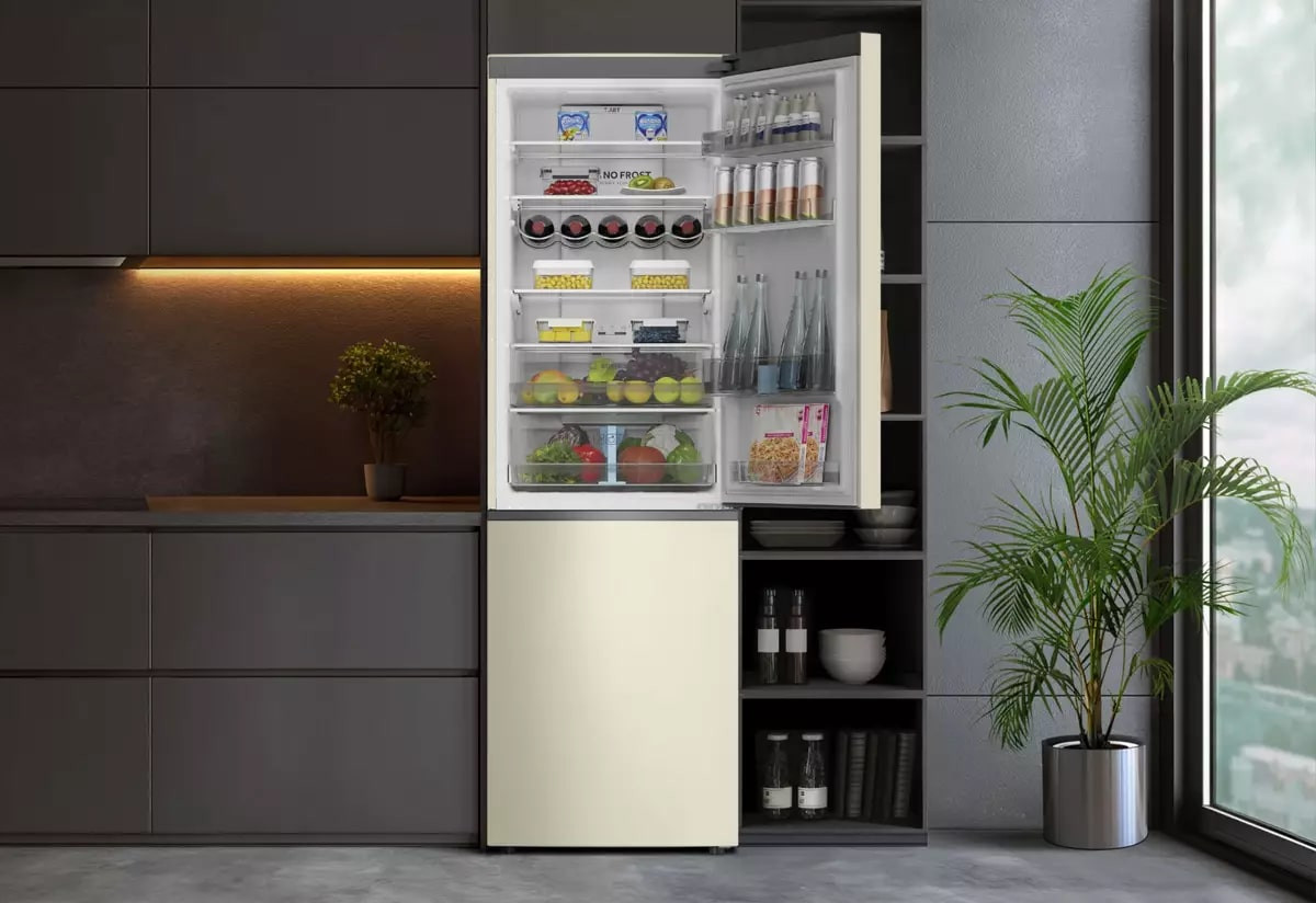Если ваша кухня оборудована в классическом стиле, то в ней будет уместен в холодильник теплого бежевого цвета. Он хорошо подойдет к таким материалам, как натуральное дерево, текстиль, натуральный камень.