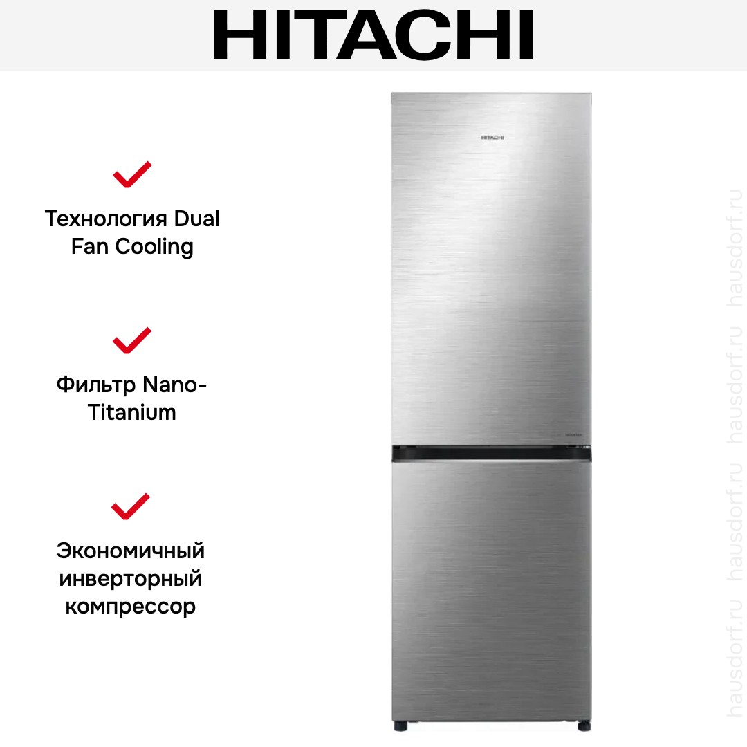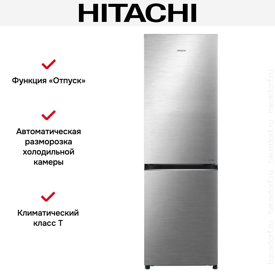 Холодильник Hitachi R-B410PUC6 BSL — отдельностоящий двухкамерный прибор с морозильной камерой внизу. Элегантный серебристый фронт из стали придает модели современный строгий облик. Встроенная ручка сохраняет чистые линии фасада.