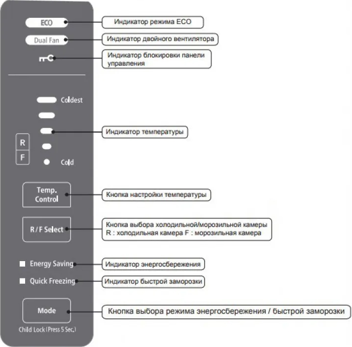 Элементы управления на панели холодильника предназначаются в первую очередь для регулировки температуры в камерах, а также для задания дополнительных параметров работы.