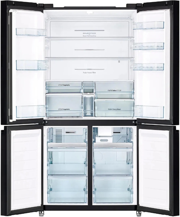 Внутреннее пространство рассчитано на большие запасы — общий объём 560 литров, из них холодильная секция 357 литров, а морозильная 103 литра. Четыре двери и расположение морозильной камеры снизу облегчают доступ к часто используемым продуктам. Три полки из закалённого стекла, две из которых регулируемые, позволяют гибко распределять пространство под высокие ёмкости. На дверях предусмотрено семь полок для бутылок и соусов, а в зоне свежести находятся контейнеры для овощей, мяса и сыра.