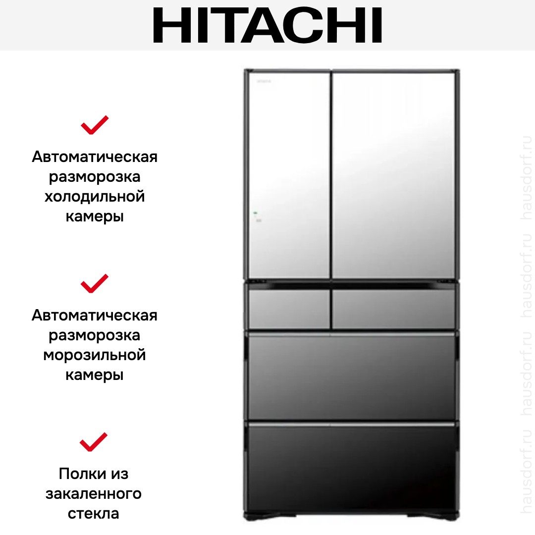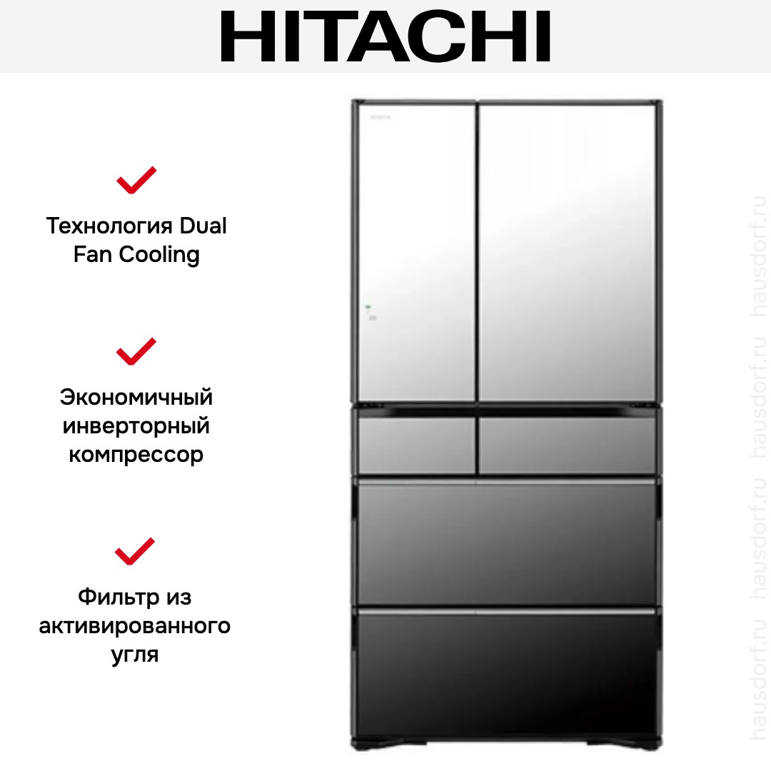 Холодильник Hitachi R-ZXC740WH-X поражает масштабом и продуманностью решений для большой семьи. Он также хорошо подойдет для тех, кто любит запасаться продуктами заранее в больших объемах. Зеркальный фасад визуально расширяет кухню и придаёт интерьеру современный блеск. Конструкция French Door обеспечивает удобное открытие створок и хороший обзор продуктов, а шесть дверей позволяют получить быстрый доступ к разным зонам без лишнего воздействия потока холодного воздуха на содержимое. Габариты 183,3×88×73,8 см и вес 144 кг говорят о добротной сборке и устойчивости.
