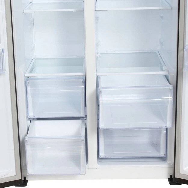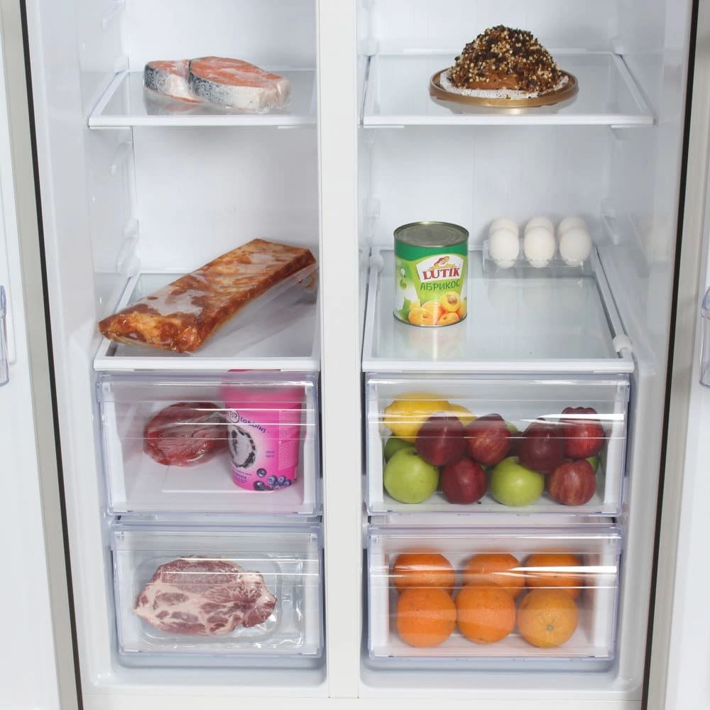 Данная модель — отдельностоящая, поэтому нужно тщательно подобрать место для ее размещения. Холодильник Side-by-Side с необычным расположением камер — сбоку друг от друга — позволяет увеличить объем продуктов для хранения. Такой вариант подходит обладателям просторной кухни, большим семьям, людям, которые запасают продукты и готовят впрок. Количество камер: 2.