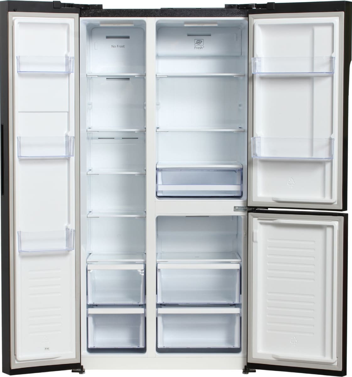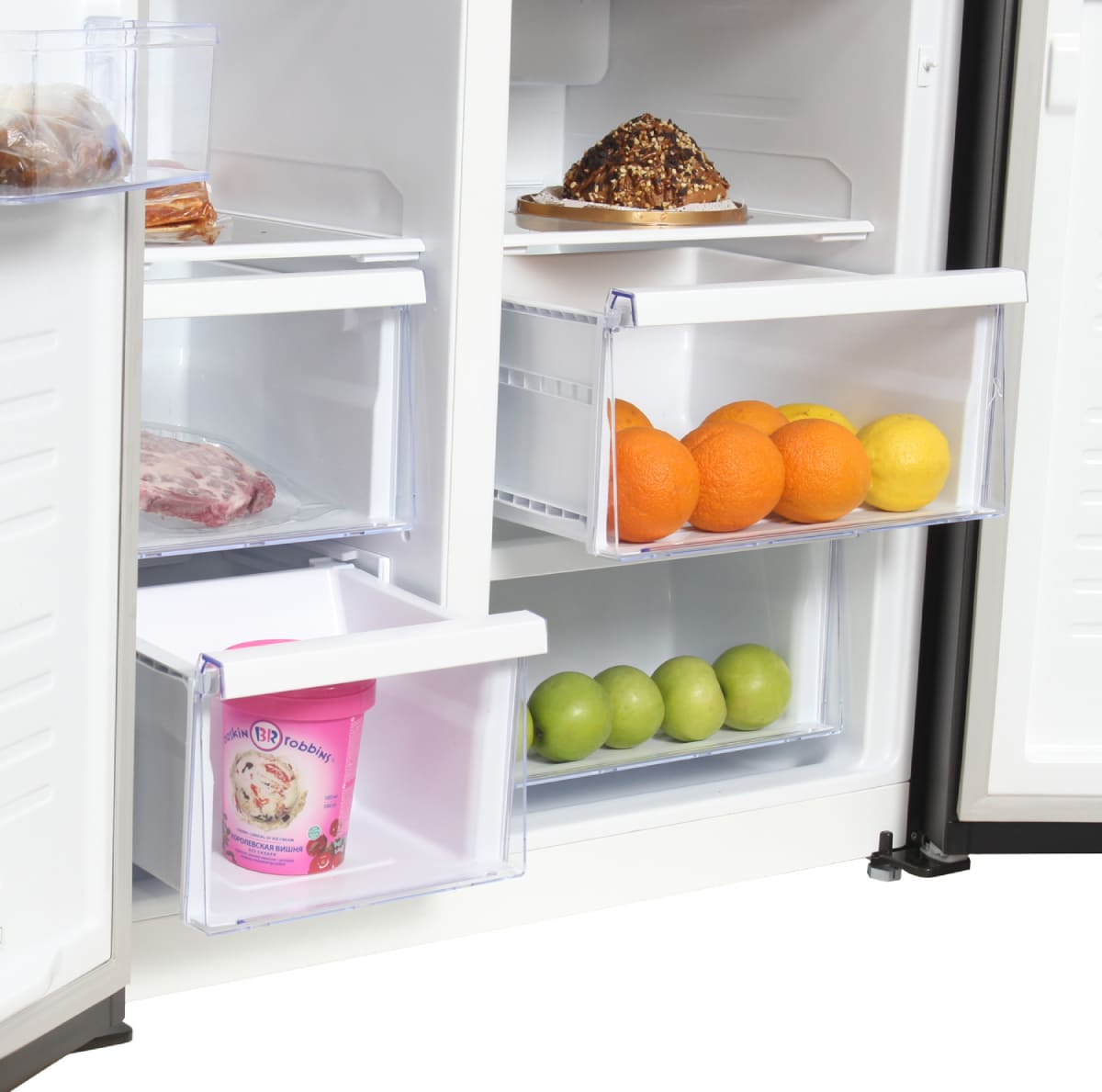 Данная модель — отдельностоящая, поэтому нужно тщательно подобрать место для ее размещения. Холодильник Side-by-Side с необычным расположением камер — сбоку друг от друга — позволяет увеличить объем продуктов для хранения. Такой вариант подходит обладателям просторной кухни, большим семьям, людям, которые запасают продукты и готовят впрок. Количество камер: 3.