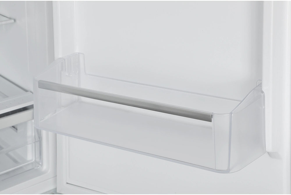 Полки в отделении бывают нескольких типов. Чаще всего встречаются полки из закаленного или ударопрочного стекла. Закаленное стекло выдерживает особенно большие нагрузки до 25 кг, так что на них можно устанавливать посуду из любого материала. Стекло является безопасным нейтральным материалом, не желтеет и не портится со временем, а также быстро и легко моется. Для того чтобы предотвратить проливание жидкости, полки оснащаются металлической или пластиковой окантовкой.