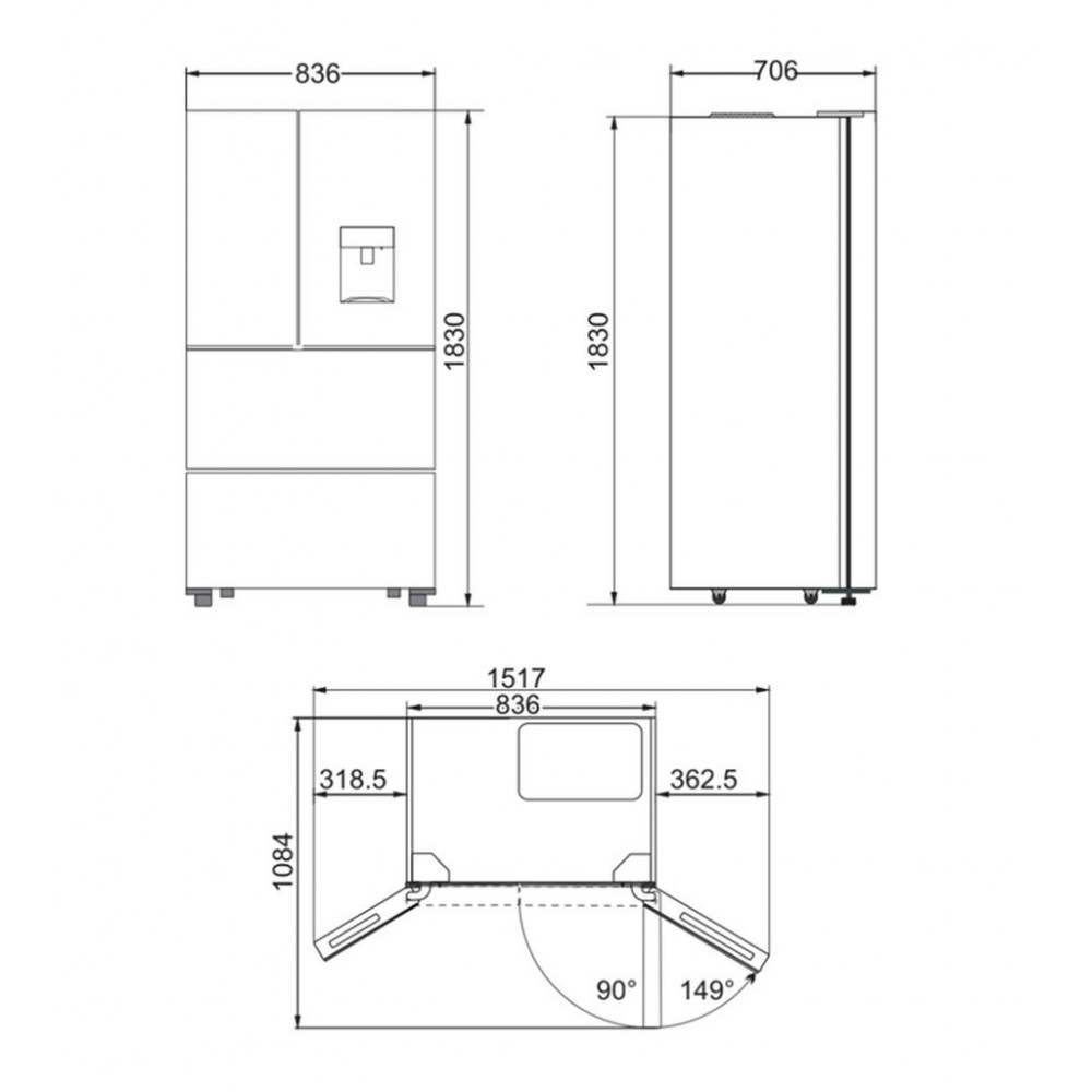 Тип: отдельностоящий. Вид: холодильник с морозильником. Ширина (см): 83.6. Количество камер: 2. Зона свежести: Да. Высота (см): 183. Дверной упор: FrenchDoor.