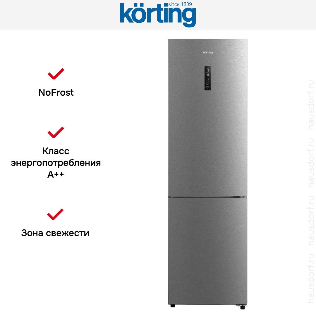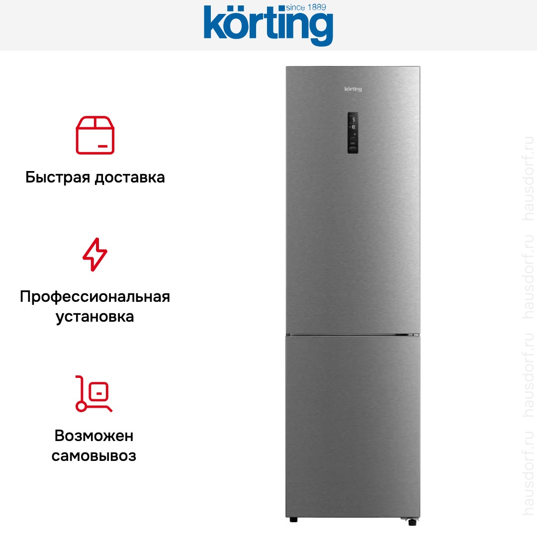 Холодильник Korting KNFC 62012 X — отдельно стоящий прибор высотой 201 см, шириной 59,5 см и глубиной 66 см. Металлическая лицевая панель придает строгий вид и легко выдерживает бытовые нагрузки. Скрытая ручка подчеркивает минималистичный дизайн. Дверцу можно перенавесить, чтобы она открывалась в другую сторону, для удобства расстановки мебели. Угол раскрытия 125° обеспечивает свободный доступ к содержимому. Регулируемые ножки помогают добиться ровного устойчивого положения прибора.