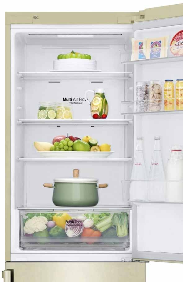 Специальная зона свежести предназначена для правильного и более длительного хранения овощей, фруктов, зелени. В ней поддерживается околонулевая температура, поэтому продукты не перемораживаются и не пересыхают. Система охлаждения этого холодильника — Multi-Airflow-System.