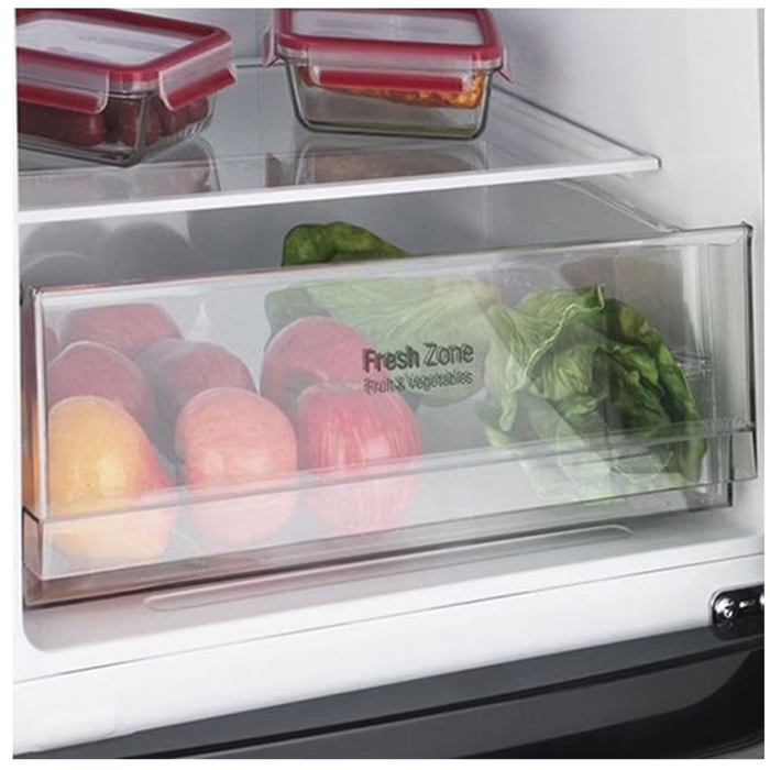 Вместительные контейнеры позволяют хранить достаточное количество овощей и фруктов. Для более длительного хранения и поддержания свежести овощей и фруктов разработаны специальные системы хранения. Среди них, например, зона свежести с увеличенной влажностью до 85% и температурой около 0 градусов. Это герметично закрывающийся ящик, часто на выдвижных роликах или направляющих, в котором имеется специальное задвижка, позволяющая регулировать влажность. Как известно, при более высокой влажности продукты с большим содержанием воды дольше остаются свежими.