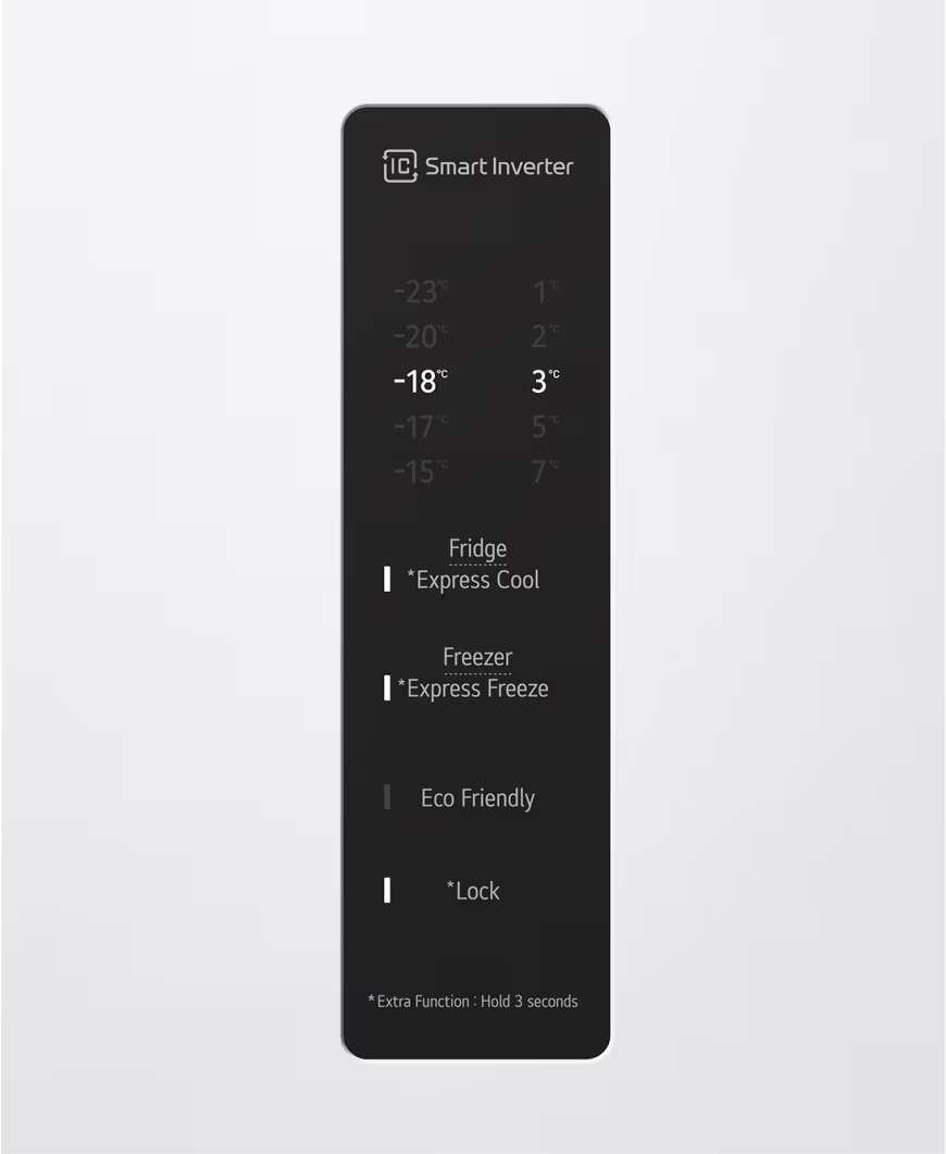 Гораздо точнее сориентироваться по индикаторам можно в холодильниках с электронной системой управления. Эти устройства обычно оснащены дисплеем, на котором высвечиваются значения фактической температуры в холодильной и морозильной камерах. Рядом с ними располагаются кнопки, во многих случаях сенсорные, при помощи которых можно регулировать температуру в каждой камере отдельно, и индикаторы включения этих камер. Здесь же, на панели инструментов, находятся индикаторы, указывающие на активацию дополнительных опций — например, режимов быстрого замораживания и быстрого охлаждения, отпускного режима, блокировки панели управления от детей.