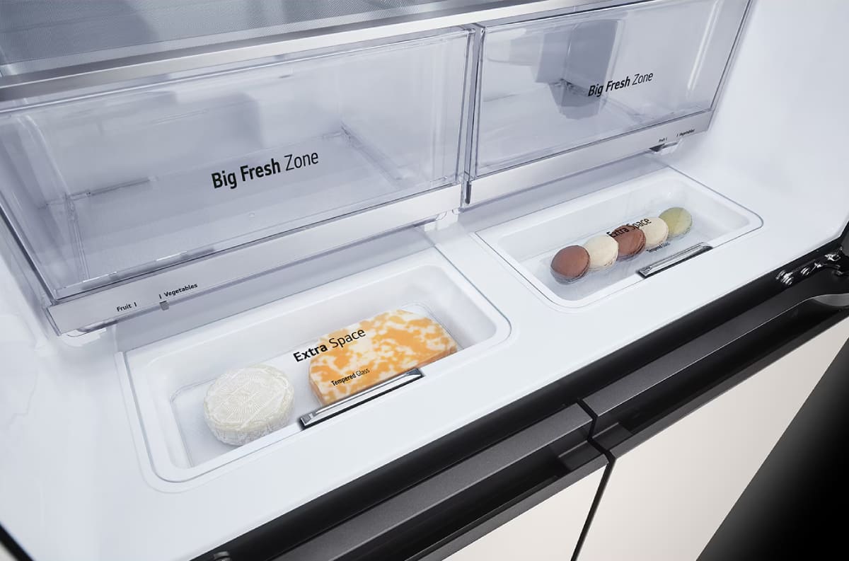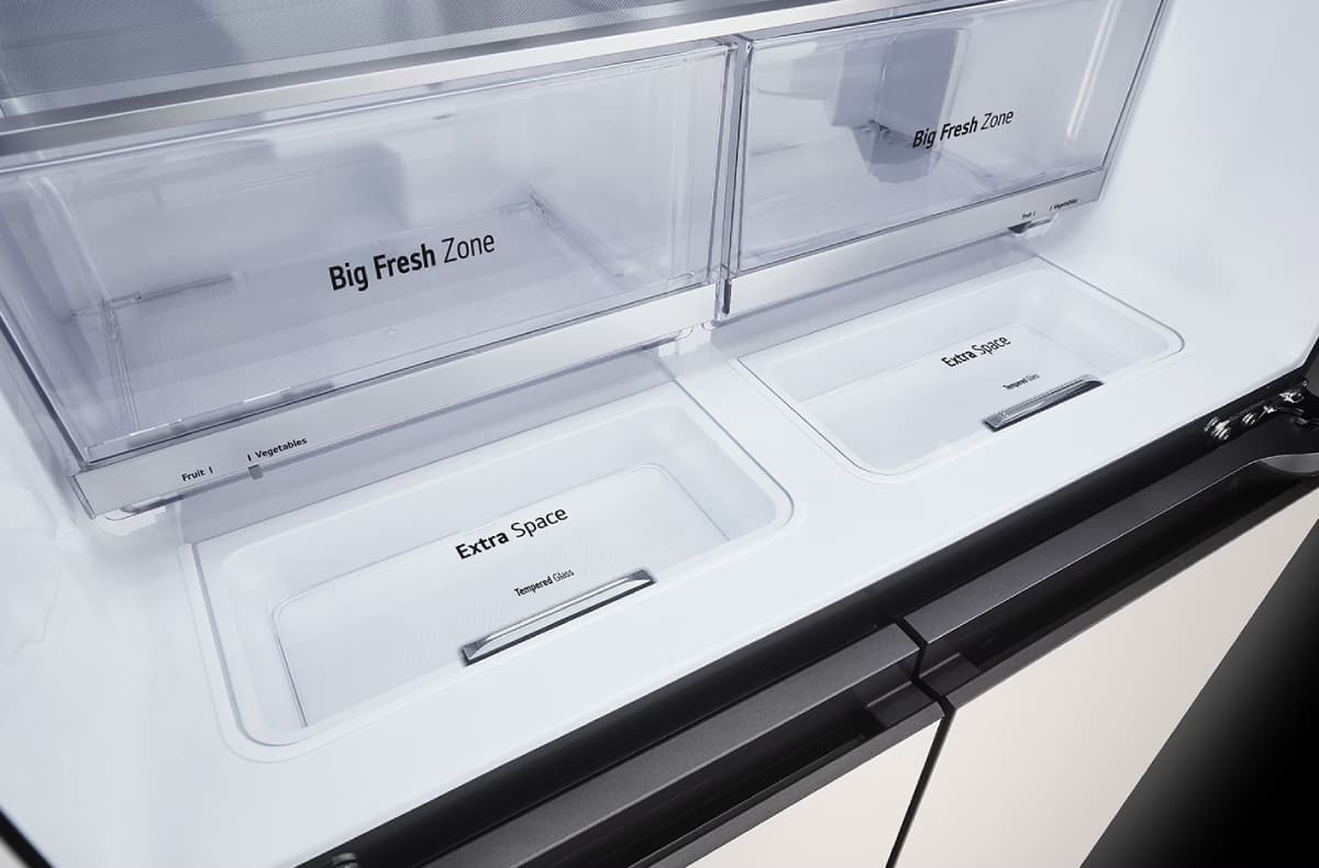 Подобная наружная «дверь в двери» может быть сплошной или прозрачной. В случае, если в дверцу вставлено стекло, его делают энергосберегающим или затемненным, причем особый датчик позволяет при двойном стуке в дверцу включать внутреннее освещение этого небольшого отделения. Подобная технология не только способствует сохранению качества продуктов, но и позволяет сэкономить электроэнергию.