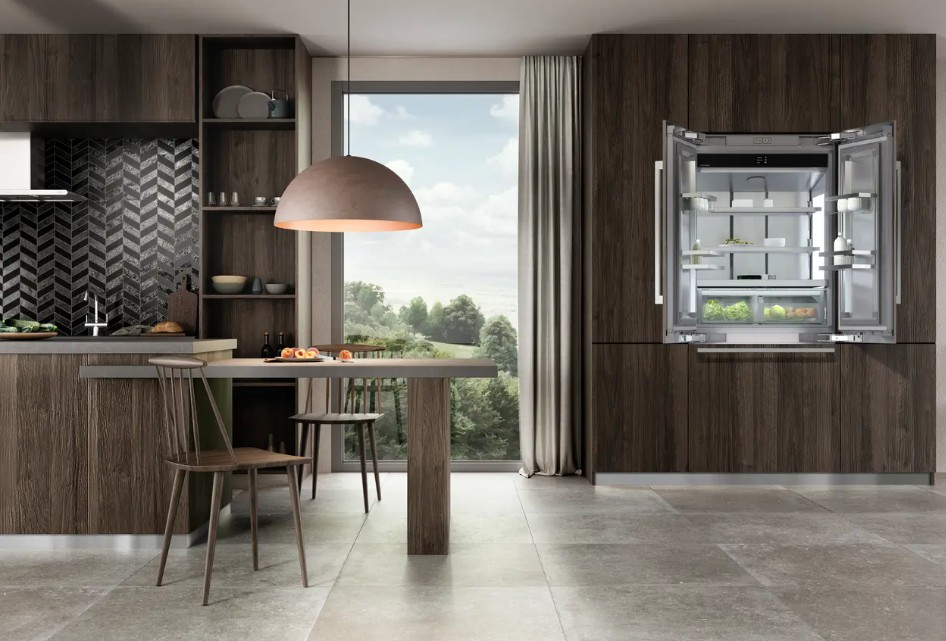 Если ваша кухня оборудована в классическом стиле, то в ней будет уместен в холодильник теплого бежевого цвета. Он хорошо подойдет к таким материалам, как натуральное дерево, текстиль, натуральный камень.
