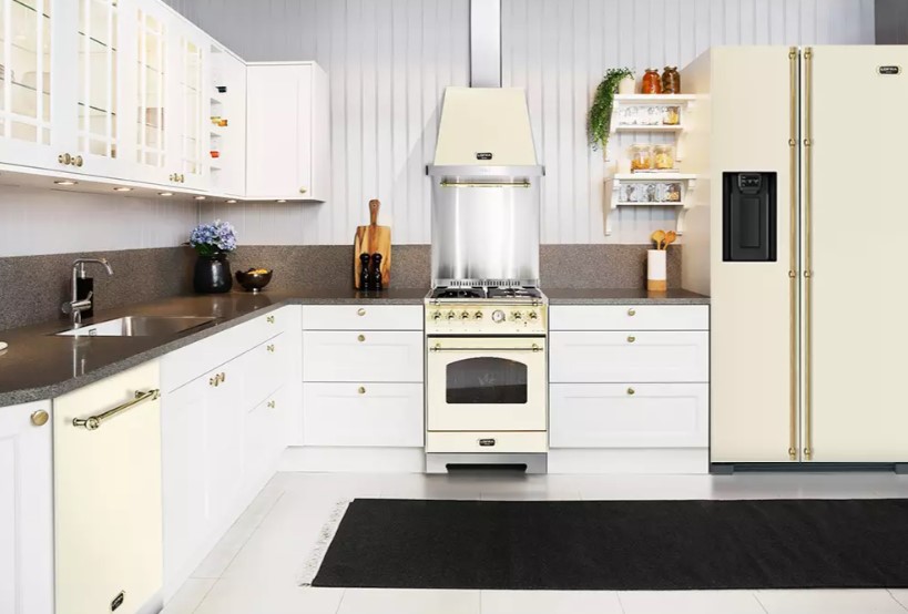 Если ваша кухня оборудована в классическом стиле, то в ней будет уместен в холодильник теплого бежевого цвета. Он хорошо подойдет к таким материалам, как натуральное дерево, текстиль, натуральный камень.