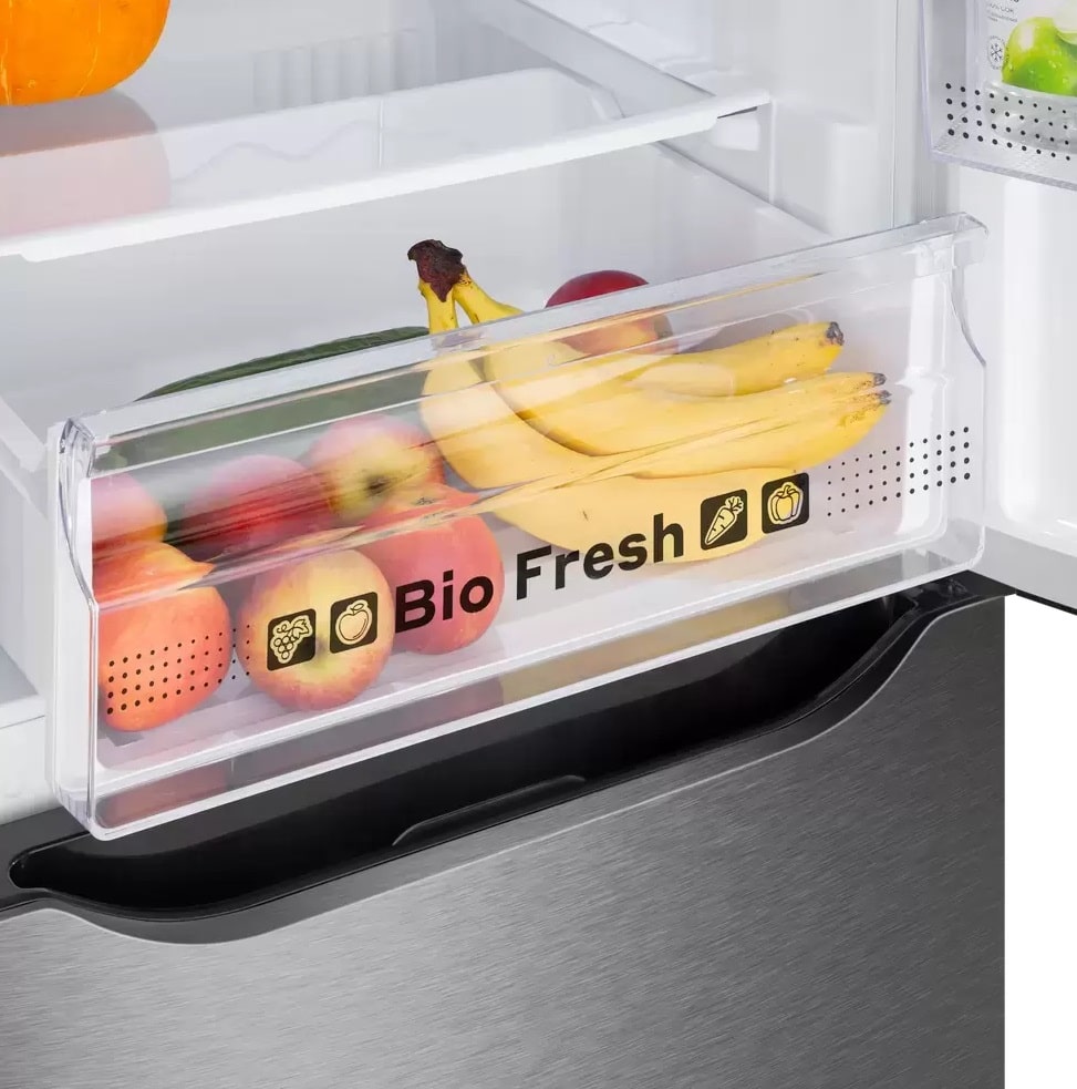 Специальная зона свежести предназначена для правильного и более длительного хранения овощей, фруктов, зелени. В ней поддерживается околонулевая температура, поэтому продукты не перемораживаются и не пересыхают.