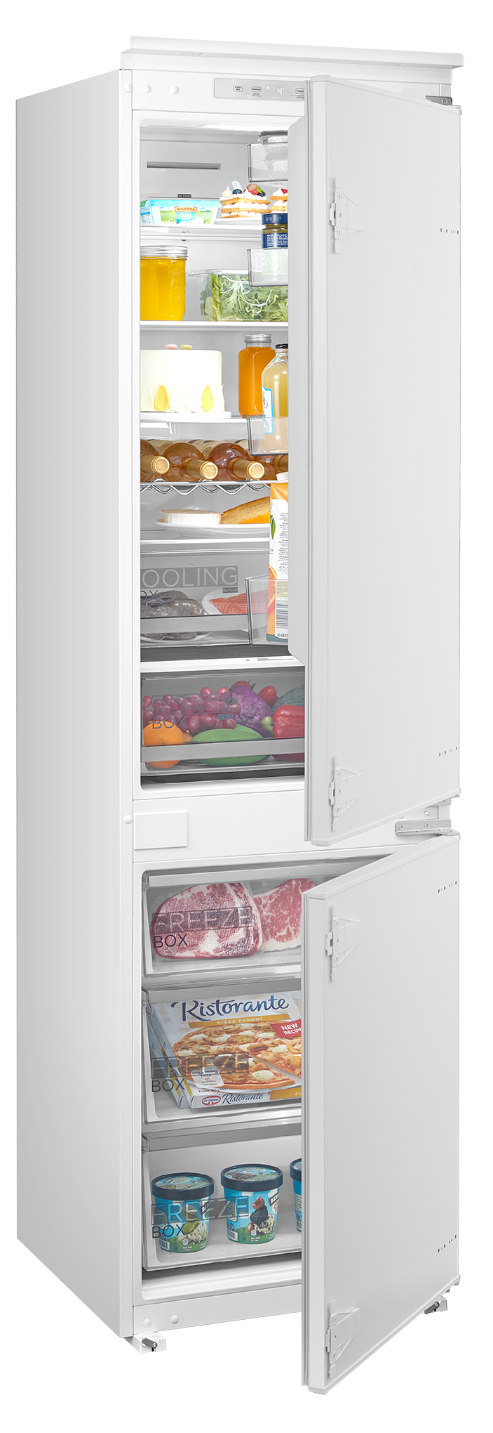 Встраиваемые холодильники монтируются в нишу или колонну. Передняя их часть закрывается декоративным мебельным фасадом и снаружи не отличается от дверцы обычного кухонного шкафа, так что их не нужно подбирать под интерьер помещения. Объем этих холодильников, как правило, несколько меньше, чем у отдельностоящих, так как при встраивании необходимо оставлять свободное пространство для вентиляции. Они отличаются меньшим уровнем шума, а также лучше держат холод и отличаются большей экономичностью из-за дополнительного слоя изоляции. Ассортимент этих холодильников не так велик, как у отдельно стоящих, установка более трудоемкая, а стоимость обычно несколько выше.
