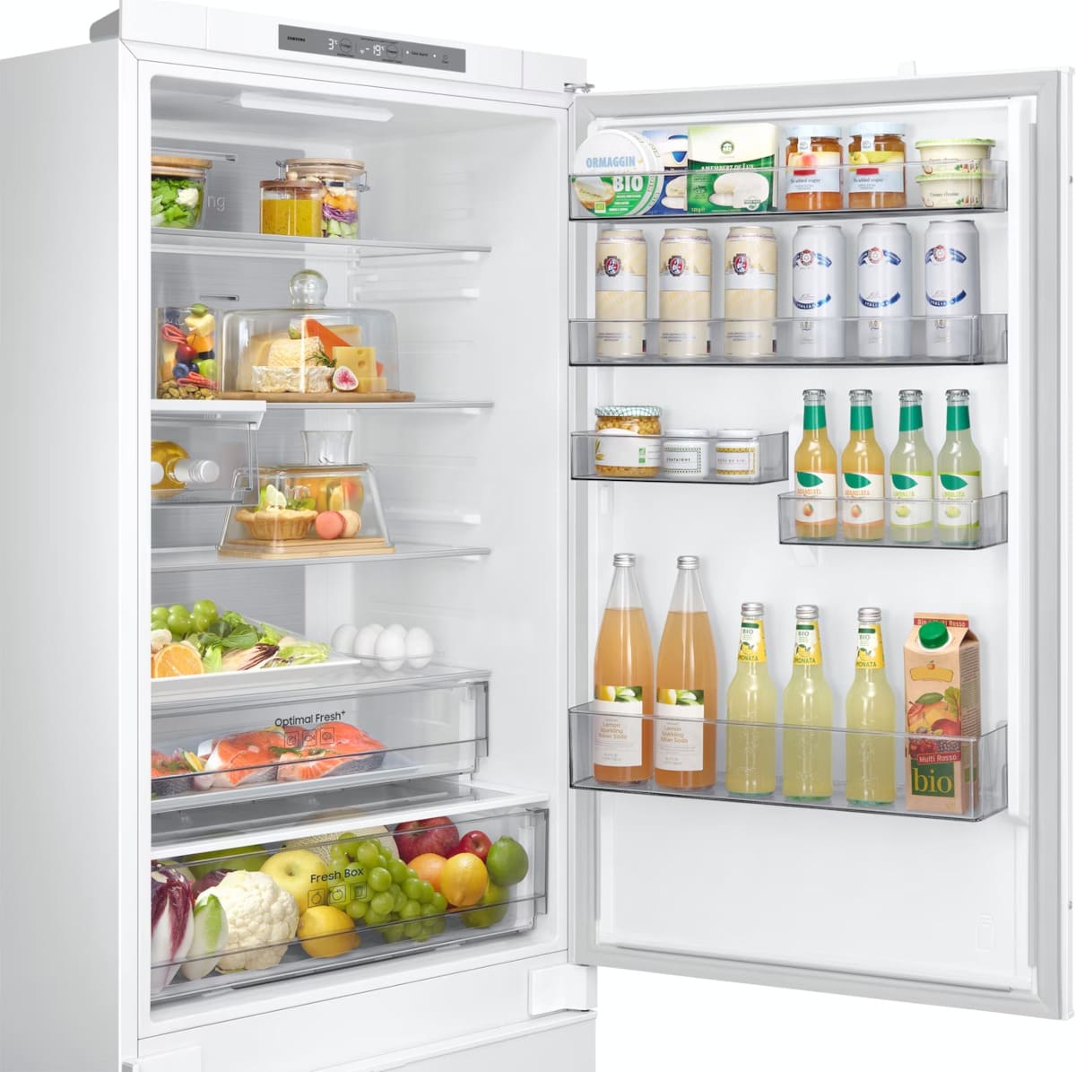 Встраиваемый прибор проще разместить в комнате, даже если общий метраж не такой уж большой. Вы можете спрятать его за декоративной панелью от мебельного фасада — советуем заранее определить нишу и заказывать панели исходя из типа крепления к двери. Способ монтажа в данной модели: скользящее крепление двери (система door sliding) Благодаря внушительным размерам, в частности высоте, она подходит большим пространствам — просторной кухне, еврогостиной. Вы можете поменять направление открывания двери, так как упор переставляемый и ее можно перевесить на другую сторону. Такая функция открывает больше возможностей для установки. Холодильник с морозильником обладает всеми опциями, которые чаще всего ищут и выбирают покупатели. Стандартная конфигурация — универсальный вариант для любой квартиры. Количество камер: 2.