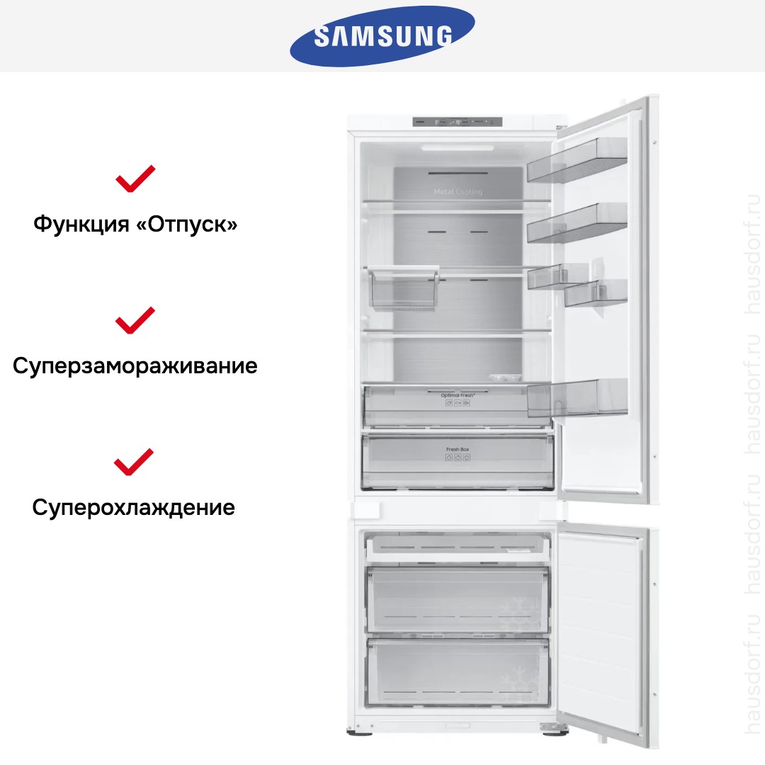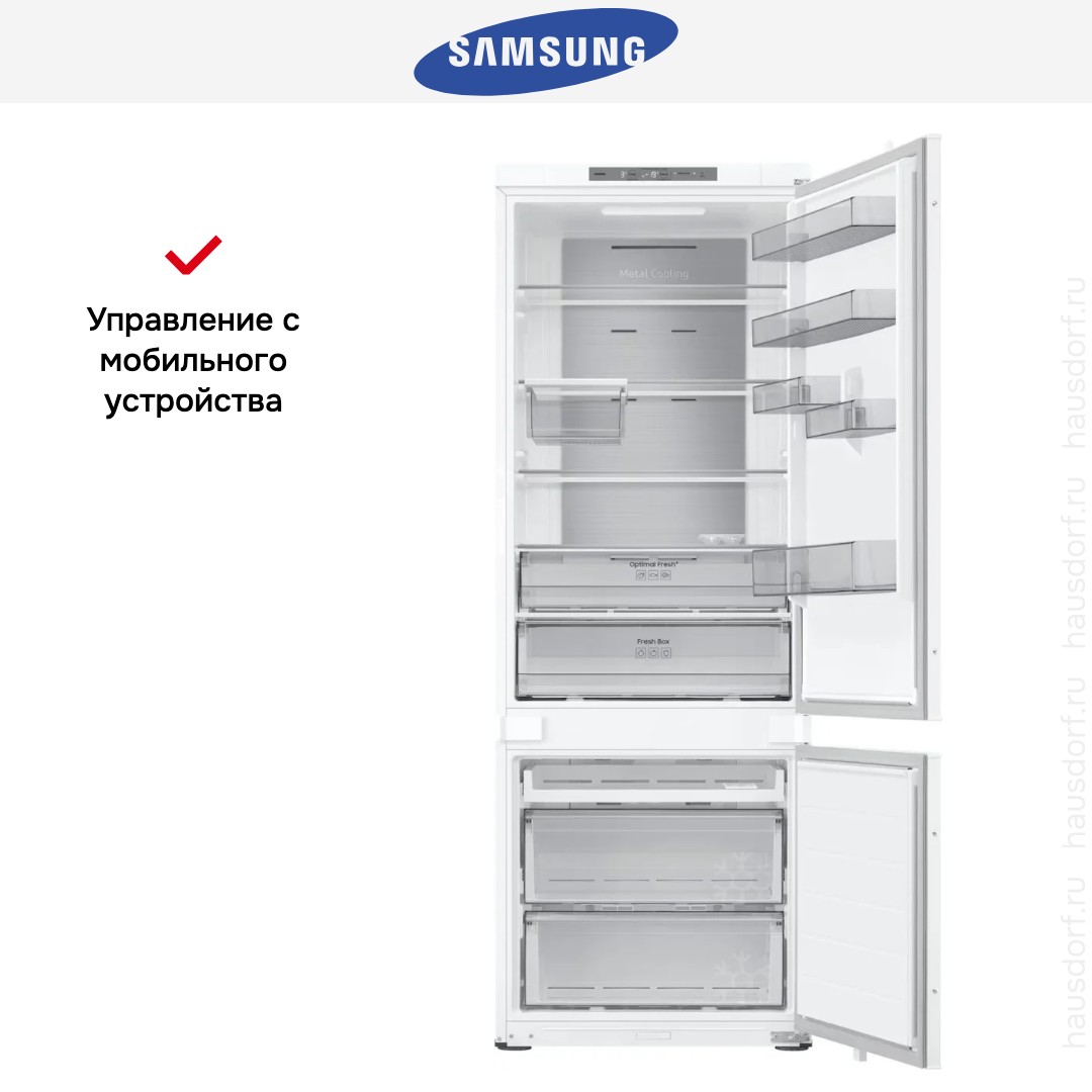 Встраиваемый холодильник Samsung BRB38G705EWW — стильное и функциональное решение для кухни. Его конструкция позволяет закрыть фасад декоративной панелью под любой цвет и фактуру. Благодаря этому прибор станет гармоничной частью интерьера. Габариты 193,5×69×55 см и требования к нише 193,8×71,2×57 см делают установку предсказуемой, а система скользящего крепления двери упрощает монтаж в ограниченном пространстве. Масса устройства около 85 кг обеспечивает устойчивость и надежность.