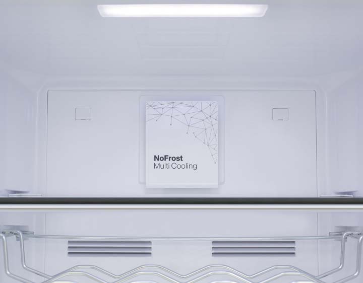 No Frost (Total No Frost, Frost Free): вентилятор обеспечивает циркуляцию охлажденного воздуха, благодаря чему лед не нарастает на стенке, а концентрируется только на скрытом внутри холодильника испарителе. Талая вода собирается в специальной емкости и испаряется. Такой холодильник не нужно размораживать – это экономит время и позволяет не останавливать прибор. Благодаря этим плюсам в современных моделях No Frost – самая распространенная система.