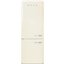Двухкамерный холодильник в стиле 50-х выполнен в кремовом цвете, который подойдет интерьерам в светлых оттенках. Прибор работает с полным No Frost, который позволяет равномерно охлаждать или замораживать продукты без намерзания инея. Благодаря этой системе также проще ухаживать за холодильником, так как не нужно его размораживать. В холодильном отделении большинство полок регулируются по высоте, на них можно разместить посуду разного размера. Они сделаны из закаленного стекла, которые выдержат тяжелые блюда. В отдельной зоне сохранения свежести вы можете держать овощи, фрукты и зелень дольше, чем в обычном отсеке. В морозильном отсеке три вместительных ящика и ручной ледогенератор.