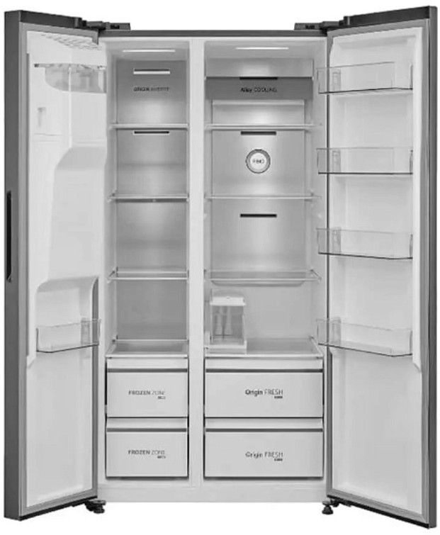Данная модель — отдельностоящая, поэтому нужно тщательно подобрать место для ее размещения. Холодильник Side-by-Side с необычным расположением камер — сбоку друг от друга — позволяет увеличить объем продуктов для хранения. Такой вариант подходит обладателям просторной кухни, большим семьям, людям, которые запасают продукты и готовят впрок. Количество камер: 2.