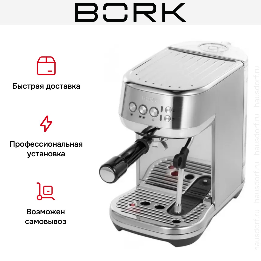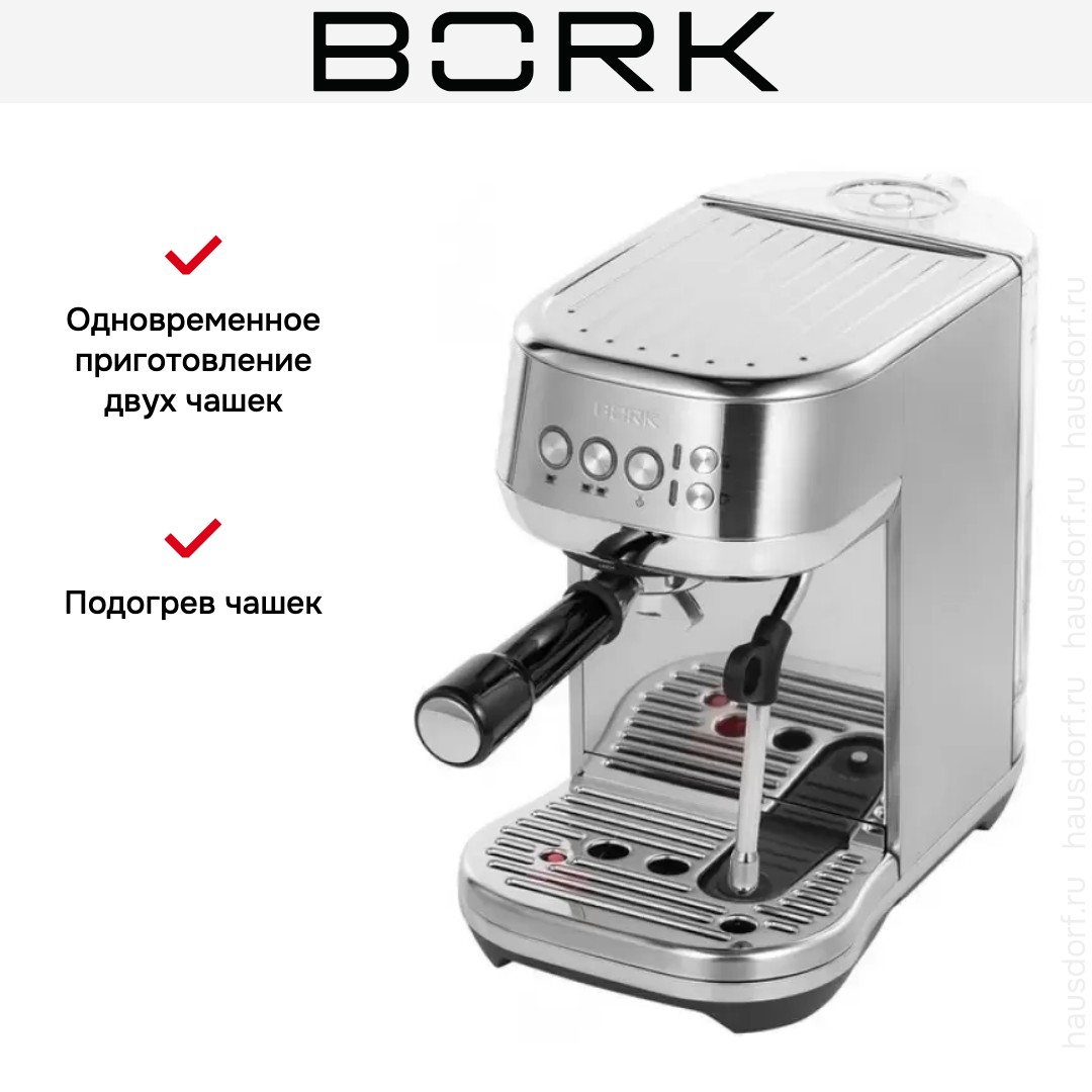 Корпус компактной настольной рожковой кофеварки BORK C701 изготовлен из нержавеющей стали. Ширина ее составляет 19 см, а вес всего 4,7 кг — такая кофеварка пригодится и в домашней обстановке, и в офисе. Интуитивно понятная кнопочная панель управления позволит выбрать приготовление одной или двух чашек кофе одновременно с предварительным их подогревом. Получить молочную пену можно, нажав на отдельную кнопку. Мощность 1300–1600 Вт и давление пара 15 бар обеспечат наилучшее качество напитка. Резервуар для воды объемом 1,9 литров и вместительный кувшин-питчер для молока позволит вам приготовить кофе для нескольких человек. Фильтр для воды защитит от накипи и гарантирует насыщенный и чистый вкус. Раскрыть его еще полнее позволит функция предварительного заваривания. О необходимости очистки варочного блока предупредит специальная индикация. Для очистки можно воспользоваться чистящим диском. Еще один автоматический режим предназначается для удаления накипи с деталей кофеварки.