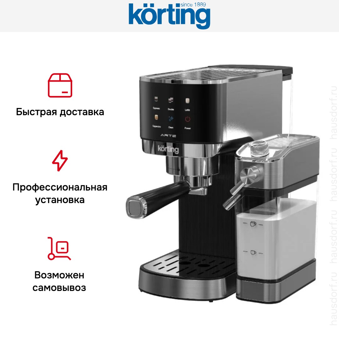В модели Korting KCM 1005 T Arte используется молотый кофе: экспериментируйте с сырьем крупного и среднего помола, чтобы добиться идеального вкуса. Данная рожковая кофемашина предназначена в основном для приготовления эспрессо и капучино; благодаря быстрой работе и отсутствию кофейной взвеси в чашке она востребована как в быту, так и в офисах.