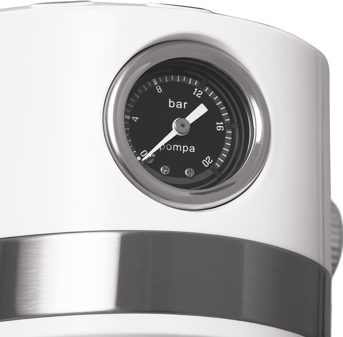 Визуальные характеристики кофемашины играют важную роль при выборе. Цвет корпуса этой модели — белый. Основной материал поверхности — нержавеющая сталь / пластик. Металлический рожок не только выглядит стильно, но и гарантирует долговечную бесперебойную работу.