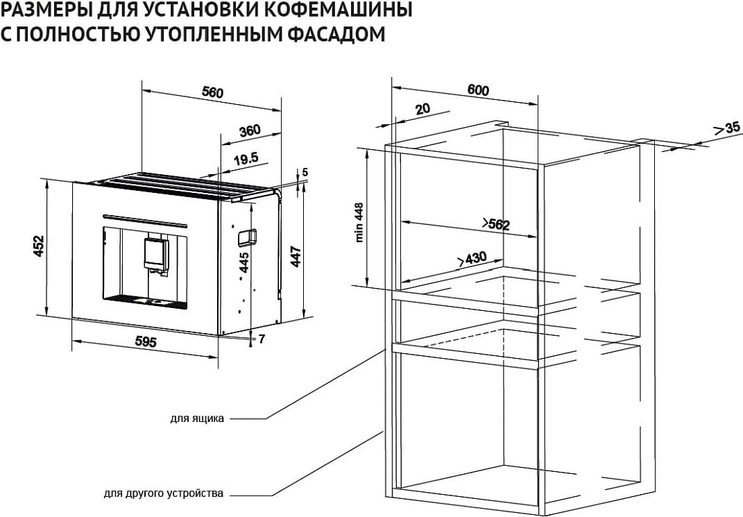 Глубина кофемашины определяется типом ее установки, возможностью приготовления капучино и подключением к водопроводу. Для встраиваемых устройств она соотносится с размерами мебельной ниши или колонны, где будет размещен прибор, и составляет от 35 см (модели Siemens) до 58-60 см (Gaggenau, Fulgor Milano). Глубина настольных моделей зависит от типа кофемашины. Минимальным ее значением — около 15 см — отличаются машины-эспрессо, модели с использованием чалд и некоторые рожковые. Глубина автоматических отдельно стоящих машин или рожковых кофейных станций может составить 40-45 см.