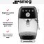 Выходит в стильной интерпретации ретро: дизайн в духе 50‑х годов, черного цвета и компактных габаритов (36.4×20.5×29.5 см). Аппарат выглядит аккуратно и продуманно: корпус из пластика сохраняет лёгкость, а металлический рожок добавляет контрастную деталь. Кнопочные и поворотные переключатели вписаны в общую эстетику, а съёмный лоток и индикатор уровня воды делают переднюю панель функциональной и понятной.