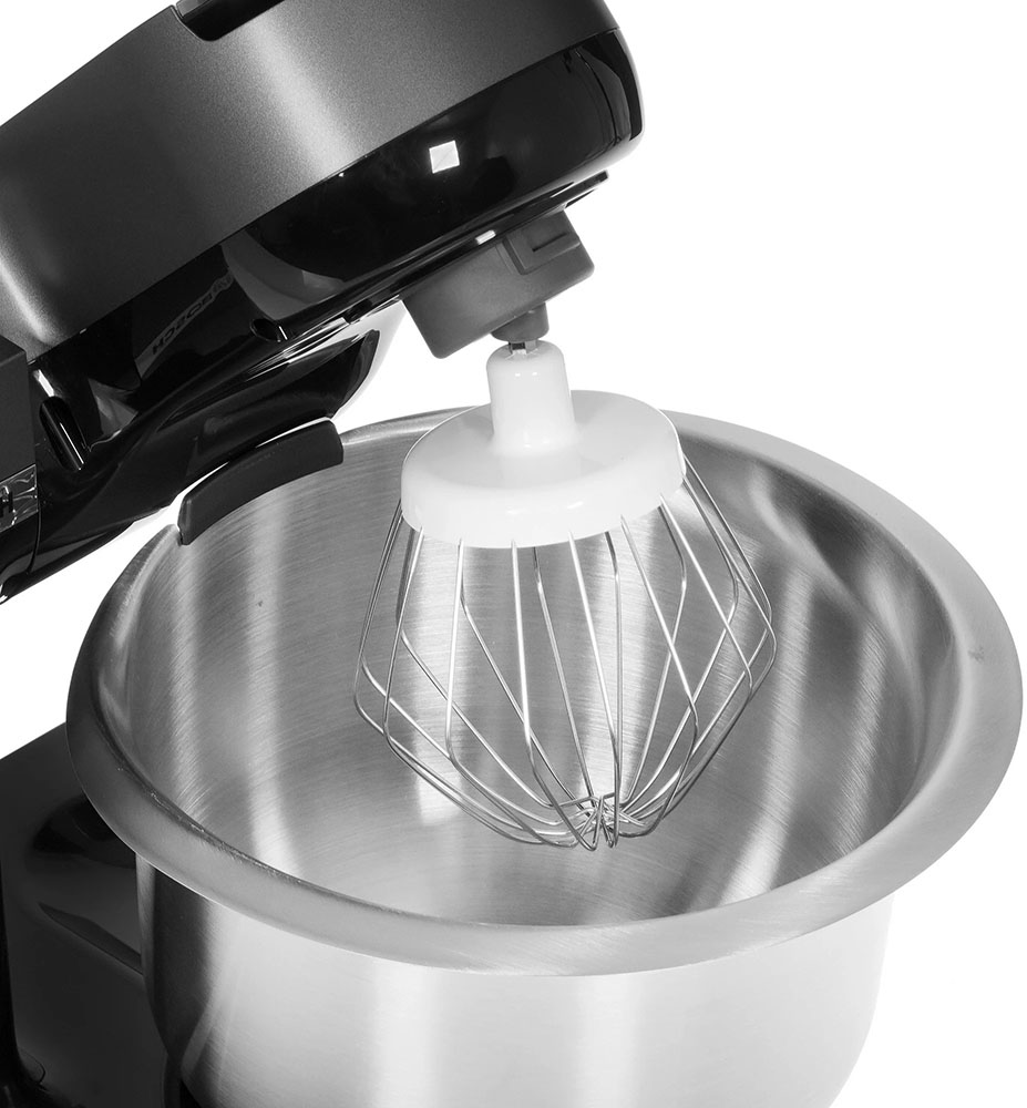 Устройство оснащено разнообразными насадками, включая универсальный нож, венчики для взбивания и крюки для замеса теста, что расширяет его функциональность и позволяет справляться с широким спектром кулинарных задач. Система надёжной фиксации и блокировки гарантирует безопасную эксплуатацию: двигатель запускается только при правильной установке всех компонентов.