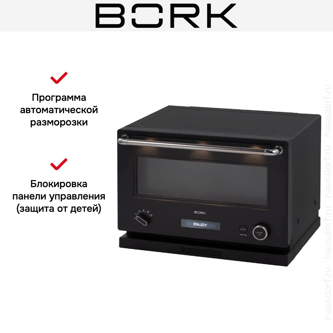 Отдельностоящая микроволновая печь BORK W750 bk — компактное и полезное дополнение к уже имеющейся кухонной технике. Ее можно установить на шкаф, на свободную столешницу, но не рекомендуется ставить на другие приборы, например, холодильник. Цвет этой модели: черный.