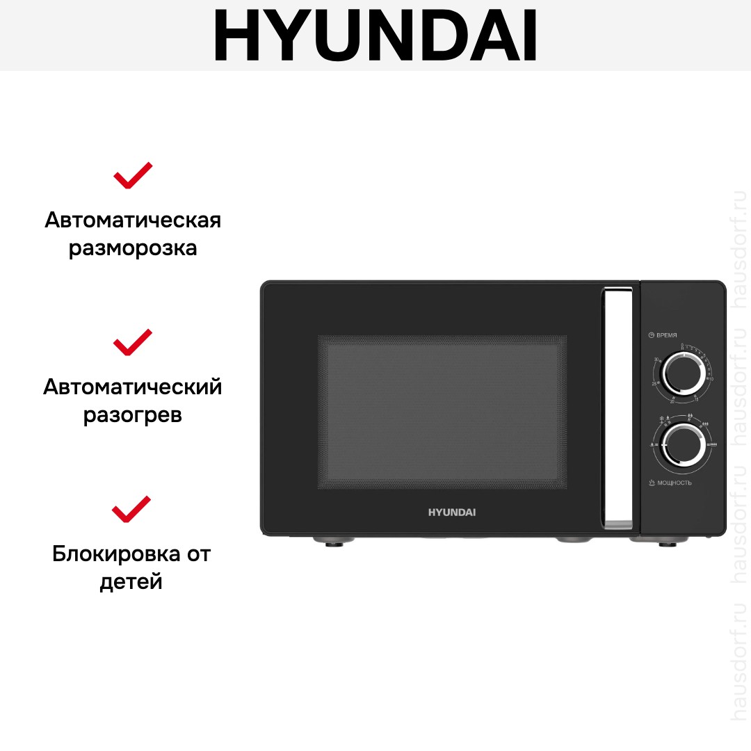 Количество режимов в данной модели Хендай: 6 шт. Для обработки продуктов и готовых блюд используются следующие виды нагрева: Микроволны, Автоматический режим разморозки, Автоматический режим приготовления. Отдельная опция для размораживания продуктов и полуфабрикатов облегчает жизнь — не нужно самостоятельно настраивать параметры. Автоматические программы для приготовления добавлены производителем также для упрощения работы.