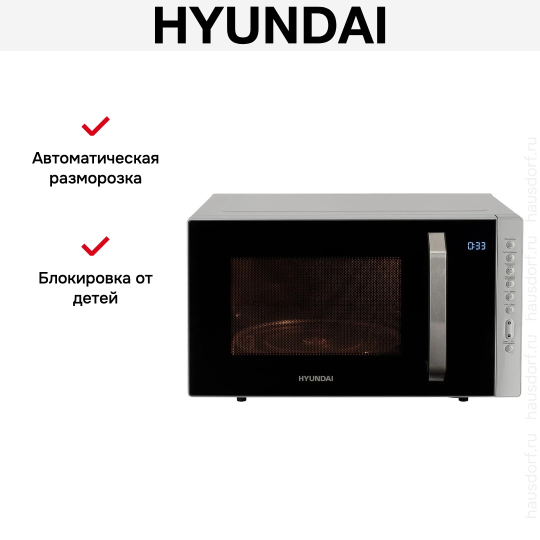 Количество режимов в данной модели Хендай: 5 шт. Для обработки продуктов и готовых блюд используются следующие виды нагрева: Микроволны, Автоматический режим разморозки. Отдельная опция для размораживания продуктов и полуфабрикатов облегчает жизнь — не нужно самостоятельно настраивать параметры. Автоматические программы для приготовления добавлены производителем также для упрощения работы.