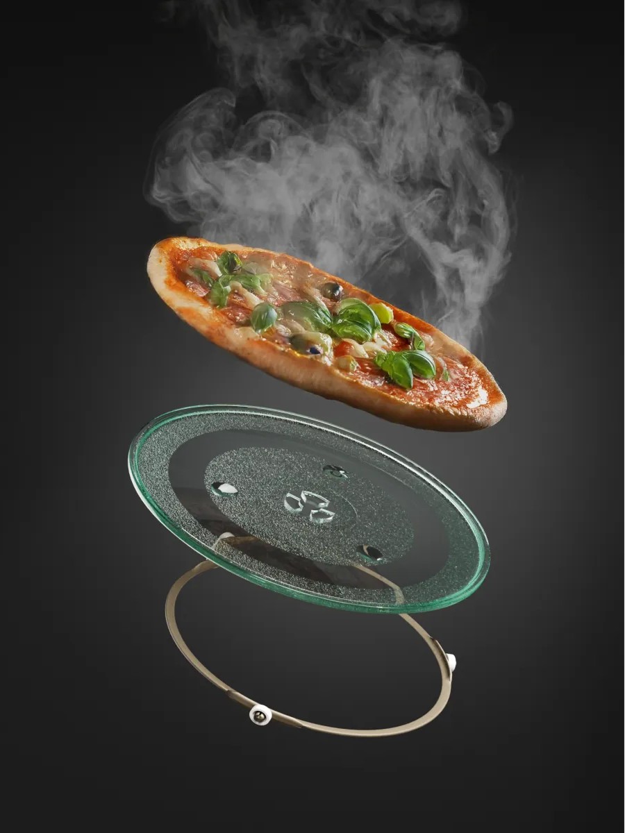 Вращающееся стеклянное блюдо в микроволновой печи позволяет микроволнам равномерно прогревать все блюдо. В большинстве печей магнетрон — источник электромагнитного излучения, — находится в нижней части корпуса или реже сбоку. Микроволны могут проникать в продукты как напрямую, так и отразившись от стенок и потолка камеры. Стеклянное блюдо, иногда называемое также поворотным столом или поддоном, устанавливается на вращающийся механизм с колесиками. Диаметр его зависит от объема камеры и может составить от 20 до 35 см. Размещать на нем можно как одну, так и несколько форм с готовящейся пищей.