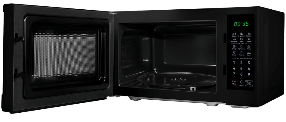 Глубина микроволновой печи —параметр, наиболее сильно влияющий на объем камеры и на диаметр вращающегося стеклянного блюда. Отдельно стоящие микроволновки соло, а также приборы, оснащенные грилем, имеют глубину от 35 до 45 см. При их установке на столешнице следует учитывать, в какую сторону и насколько широко будет открываться дверца. Глубина микроволновки, которая встраивается в кухонную мебель, также варьируется в широком диапазоне. Для полноразмерных моделей с откидной или навесной дверцей она может составить около 52-55 см, а для менее вместительных приборов — порядка 32-35 см.