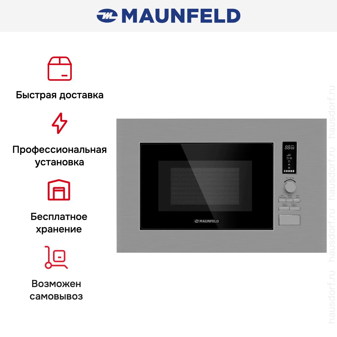 Встраиваемая микроволновая печь Maunfeld JBMO820GS01. Ее строгий корпус из нержавеющей стали придает кухне аккуратный современный вид и легко сочетается с мебелью.