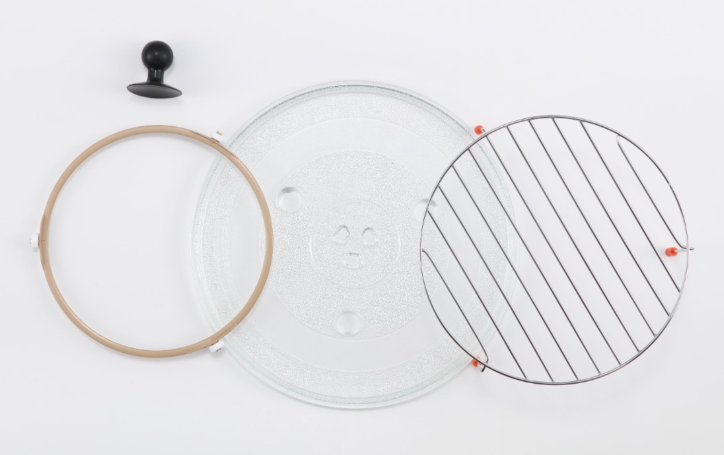 Вращающееся стеклянное блюдо в микроволновой печи позволяет микроволнам равномерно прогревать все блюдо. В большинстве печей магнетрон — источник электромагнитного излучения, — находится в нижней части корпуса или реже сбоку. Микроволны могут проникать в продукты как напрямую, так и отразившись от стенок и потолка камеры. Стеклянное блюдо, иногда называемое также поворотным столом или поддоном, устанавливается на вращающийся механизм с колесиками. Диаметр его зависит от объема камеры и может составить от 20 до 35 см. Размещать на нем можно как одну, так и несколько форм с готовящейся пищей.